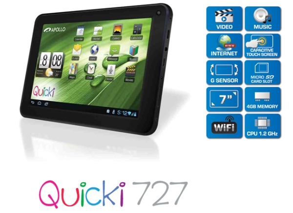 Tablet Apollo Quicki 732-B jest typowym przedstawicielem segmentu budżetowych urządzeń. Posiada 7-calowy ekran o rozdzielczości 800 x 480 pikseli, obsługujący multidotyk. Ze względu na rozdzielczość oferowany obraz jest przeciętnej jakości. W zasadzie odradzamy zakup jakiegokolwiek tabletu z taką rozdzielczością. Nadaje się ona jedynie do słabszych smartfonów lub do nawigacji samochodowych (GPS).